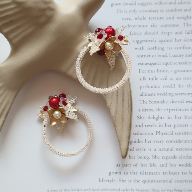 限定色 Erica -エリカ 透明感のあるビーズを使ったブーケトップと ビーズを巻き付けたフープを組み合わせた 晴れの日にふさわしいピアス/イヤリング 深みのある大人レッドカラーの クリスタルガラスやパールを使って 限定色でおつくりしました 大ぶりサイズがとても華やかで愛らしく ゲストの視線を惹きつけます ウェディングシーンや ファッションのアクセントとしても◎ 写真映えするので 前撮りやフォトブライダルにもおすすめです 【主な素材】 クリスタルパール、クリスタルガラス、 コットンパール、真鍮メッキ 【サイズ】 タテ約56mm フープの直径…約37mm ≪ご使用について≫ ●ご使用後はできるだけ密閉した袋などに入れて 保管することをおすすめします ●水を避けてご使用ください 濡れてしまった場合はやわらかい布で水分をふき取って下さい ●すべてのアクセサリーはboxにお入れして リボンをかけてお届けします そのままギフトとしてもお渡しいただけます