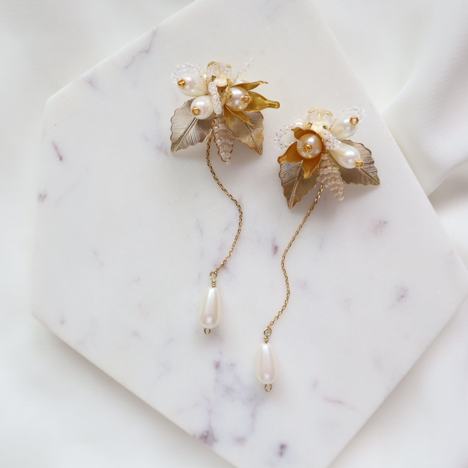 小さなビーズで編んだリーフや煌めくビーズを