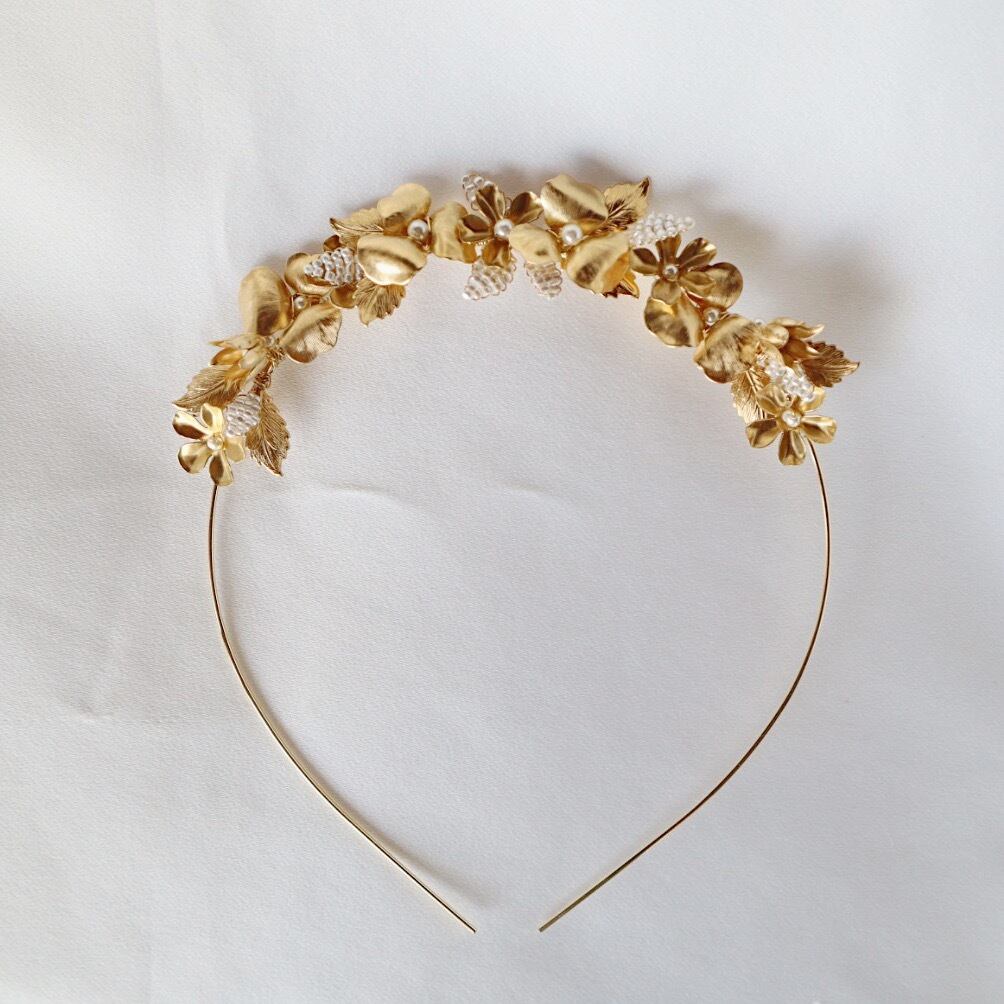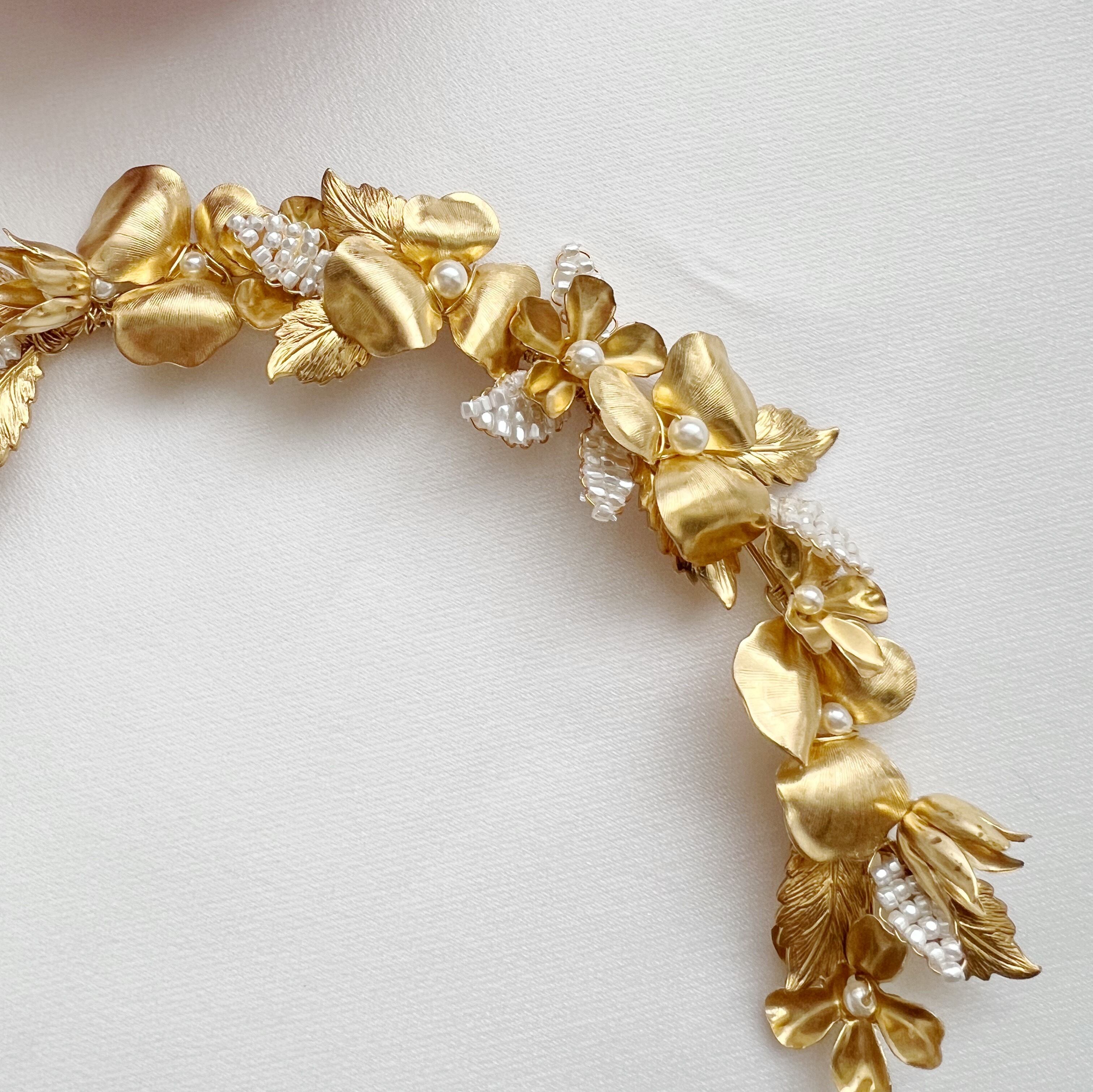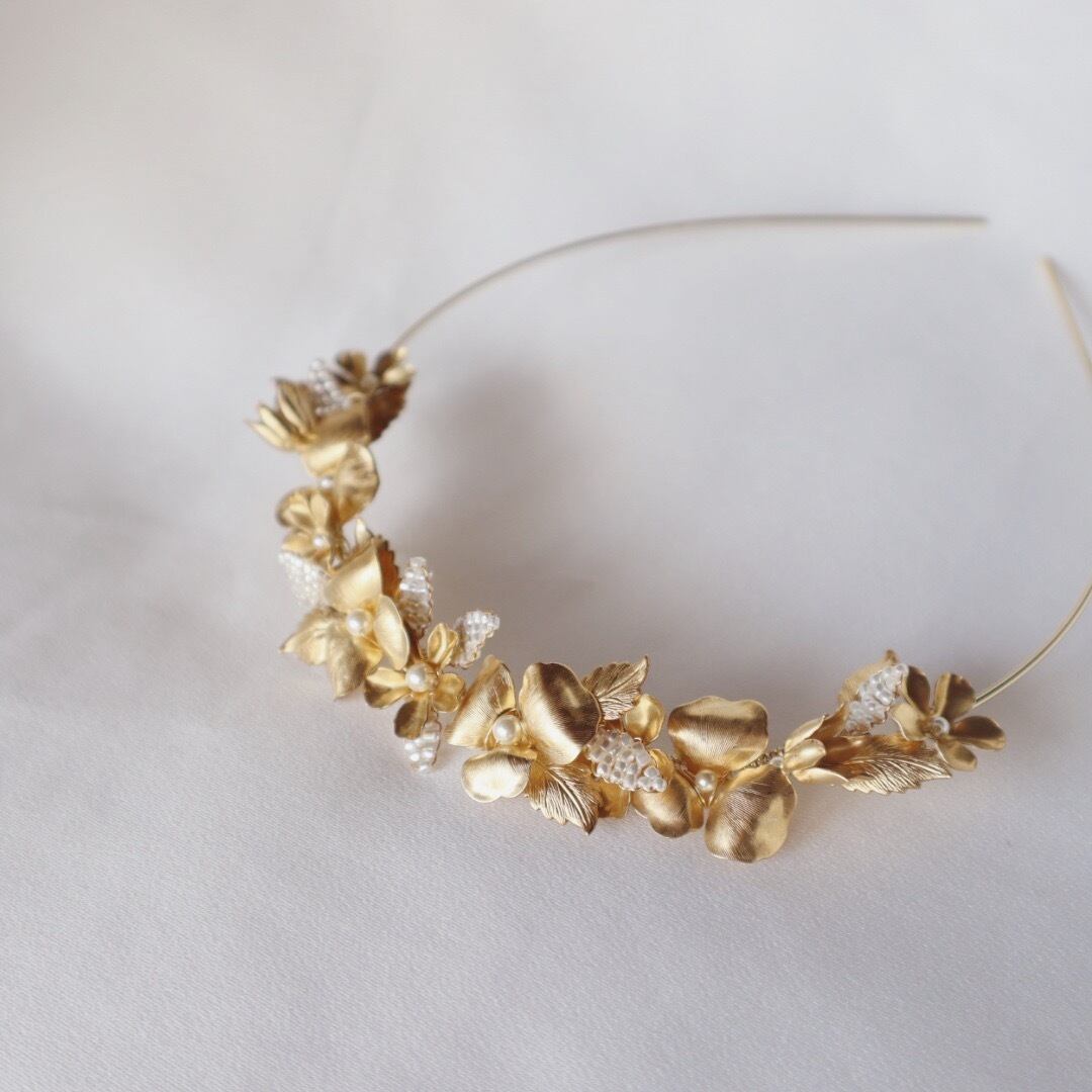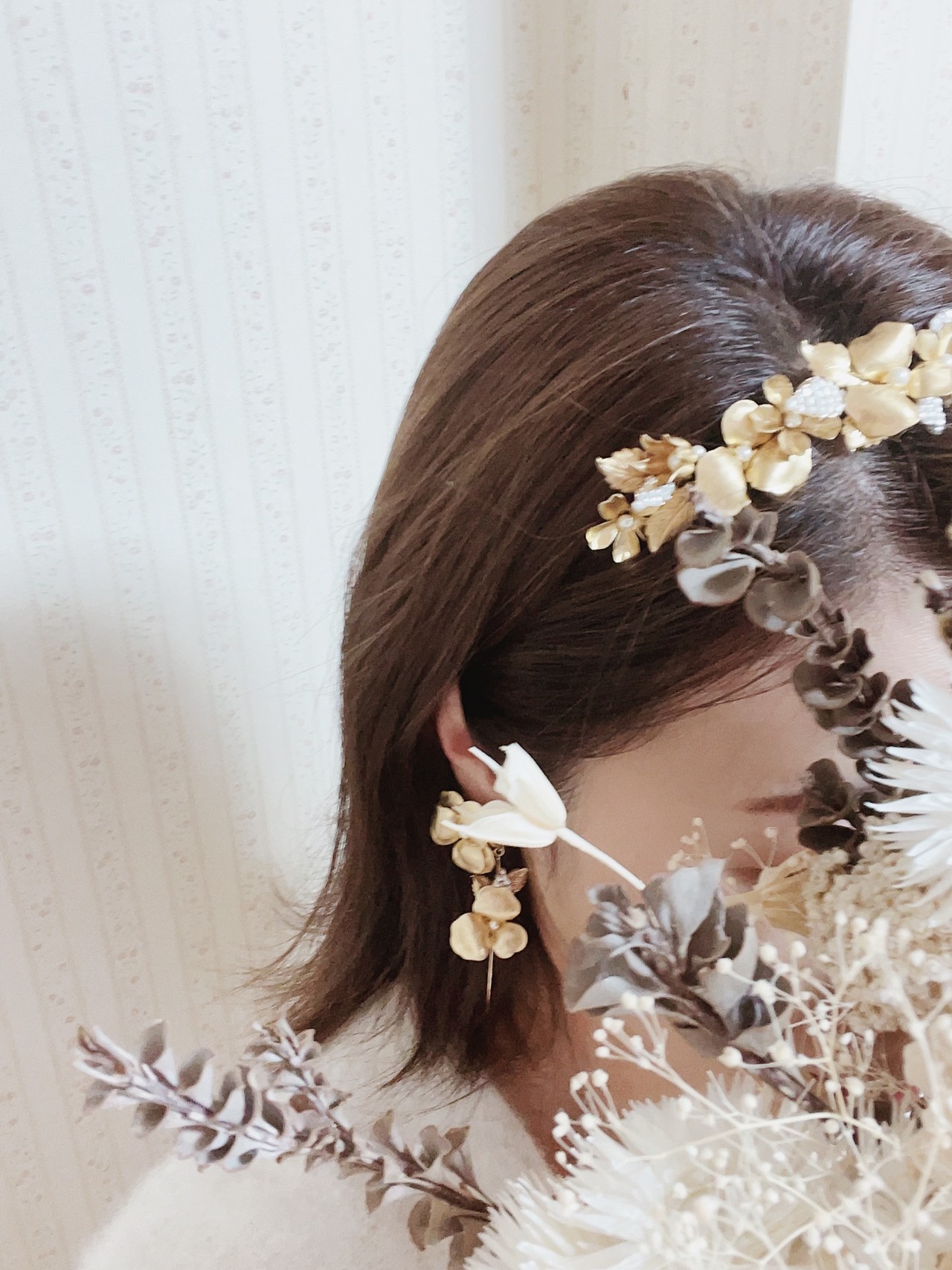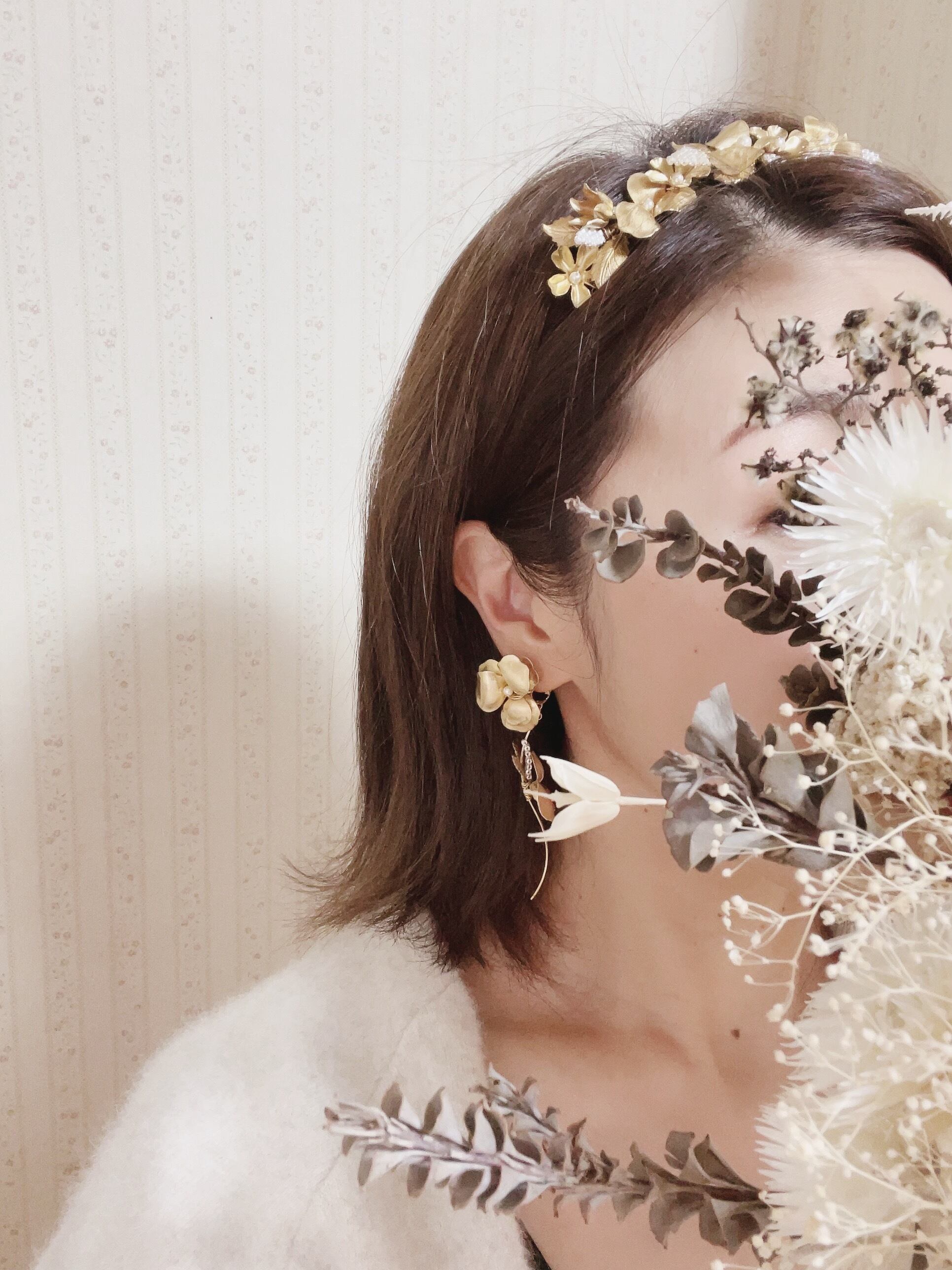 真鍮のアクセサリーはアイボリーカラーのドレスや